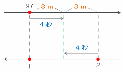 次の図のように、A君の乗った97番の座席と1番の座席がすれ違ってからの4秒間=15分の1分間で、97番と2番の座席は向かい合わせで45×15分の1=3mずつ進みます。