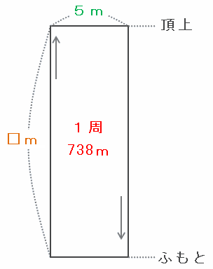 つまり次の図のように、長方形の1周は6×123=738mで、たて1辺と横1辺の長さの合計は738÷2=369mです。