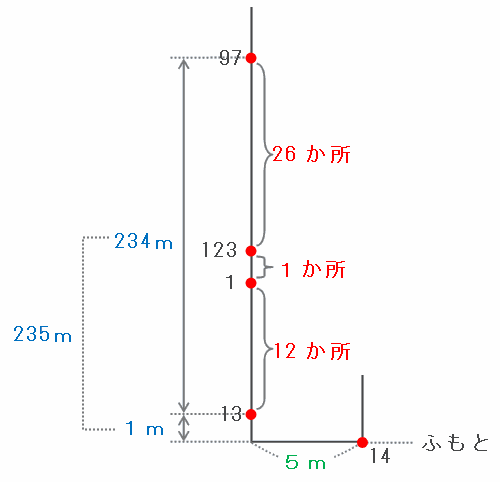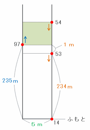 座席と座席との間はどこも6mなので、13番の座席と97番の座席は6×39=234m離れており、13番の座席はふもとから1m進んだ地点にあるので、97番の座席はふもとから234+1=235m離れています。
