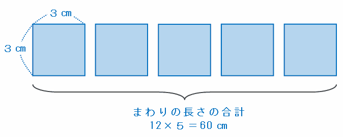 1辺3㎝の正方形の紙のまわりの長さは3×4=12㎝なので、次の図のようにその5枚を横に並べてみると、まわりの長さの合計は12×5=60㎝になります。