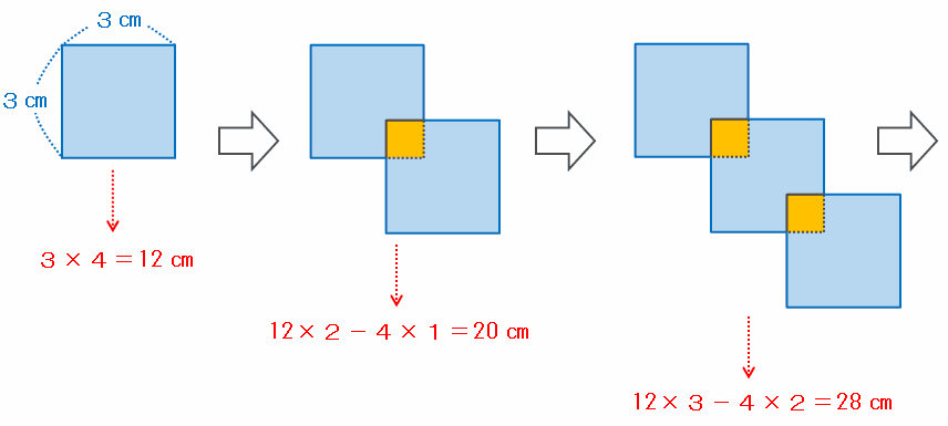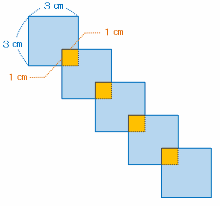 1辺の長さが3㎝の正方形の紙を次の図のように、すべてののりしろが同じ大きさの正方形となるように重ねていきます。図の青い線で囲まれた図形について、次の問いに答えなさい。