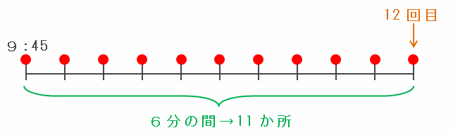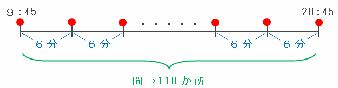 660÷6=110なので、次の図のように6分ごとにやってくる入館時間と入館時間の間は110か所あります。