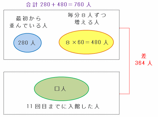 ただし、11回の入館で行列が合計□人減ったので、次の図のように60分後には行列が364人になっていました。