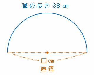 次の図のように、孤の長さ38㎝の半円の直径を□㎝とおくと、孤の長さを求める式は□×3.14÷2=38㎝と表せます。