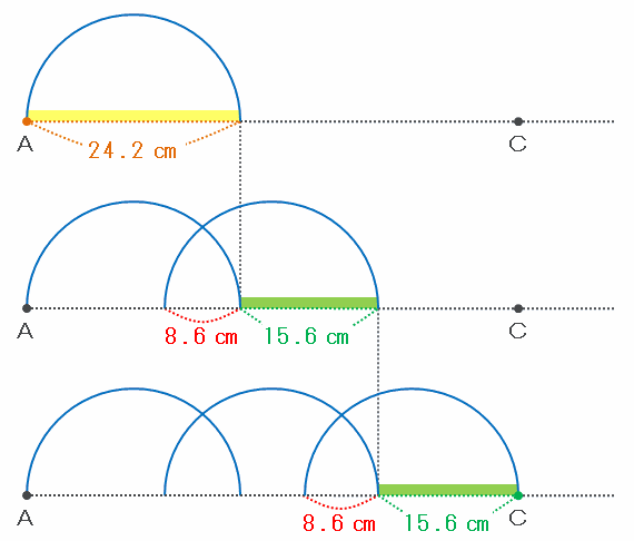 次の図のように、最初に半円を1個置き、2個目からは8.6㎝ずつ重ねながら半円を増やしていくと、