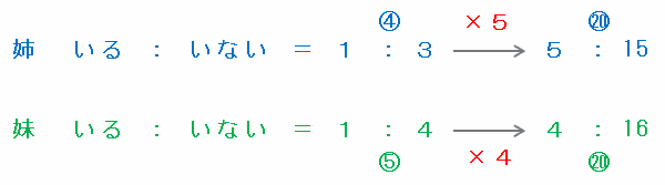 また、妹がいる人の人数はいない人の人数の4分の1なので、妹がいる人といない人の人数比は4分の1:1=1:4です。