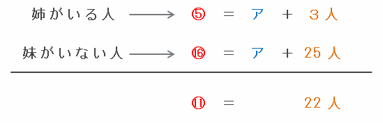 このとき、「姉がいる人(比の5)→図のア+3人」と「妹がいない人(比の16)→図のア+25人」を次の図のように並べて比べてみると、どちらにもアがあるので、比の16-5=11が、25-3=22人にあたります。