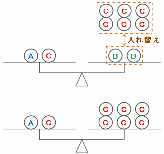 このとき、次の図のようにてんびんの右側にあるB2枚をC6枚に変えてもつりあったままなので、「A1枚とC1枚の重さの合計=C6枚の重さ」であることが分かります。