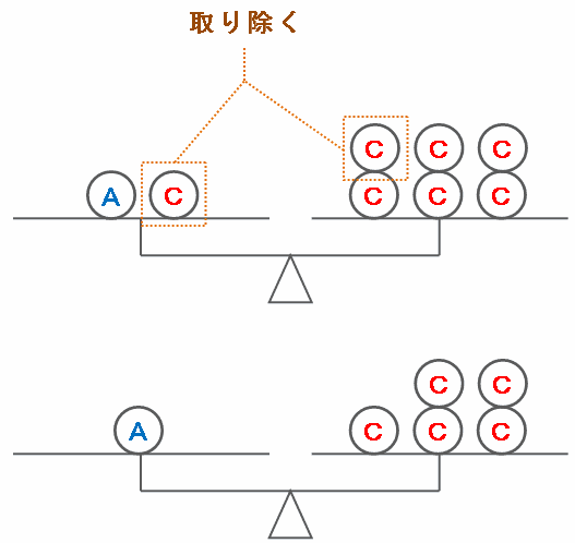 ついでに左右の皿からCを1枚ずつ取り除くと、次の図のようにA1枚とC5枚の重さが等しいことが分かるので、A1枚とC1枚の重さの比はA:C=⑤:①と表せます。