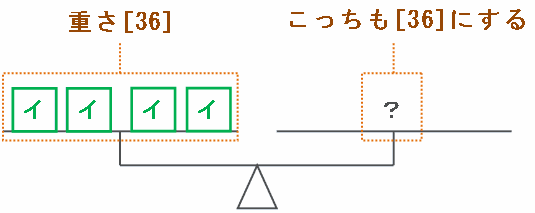 したがって、右側の皿にも箱アとウを組み合わせて[36]の重さをのせてあげればつりあいます。