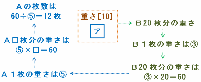 ・箱アの重さ→Aが2枚入っているとすると、⑤×2=[10]