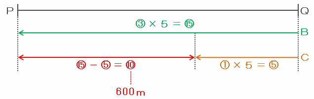 上の図の比の15-5=10が、2人が5分間に進んだ距離の差である600mにあたるので、比の1は600÷10=60m、そしてCさんが5分間に進んだ距離にあたる比の5は60×5=300mです。