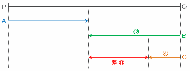 最初の4分間で、毎分3ずつ進むBさんは3×4=12、毎分1ずつ進むCさんは1×4=4進むので、その2人が進んだ距離の差は、次の図のように12-4=8になっています。