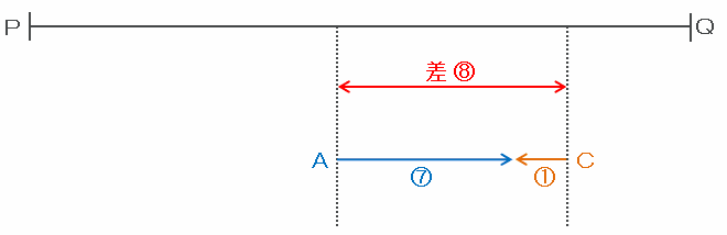 次の1分間でCさんはAさんと出会うまでに1×1=1進むので、その間にAさんが進んだ距離は、下の図のように8-1=7と表せます。