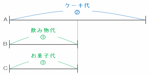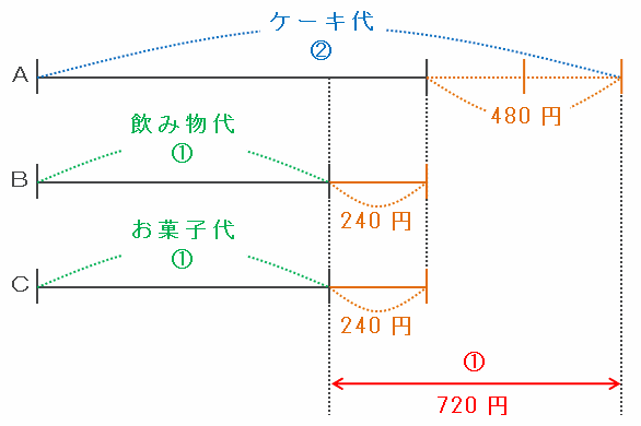 上の図だとAの支払った額がBやCの2倍で不公平なので、次の図のようにBとCはAに240円ずつあげました。