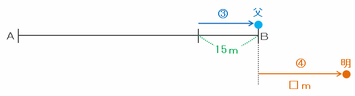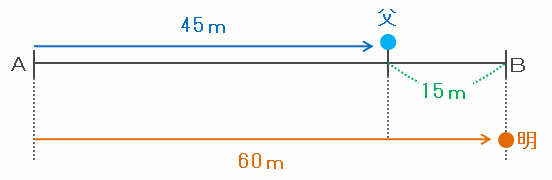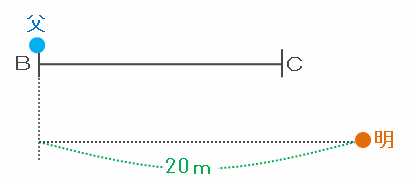 4×15÷3=20mなので、父がB地点に着いたとき、明子さんは次の図のようにそれよりも20m先の地点にいます。