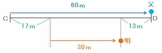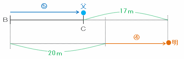 その後、お父さんはBC間を自分の足で歩き、C地点に着いたときには明子さんはそれよりも17m先の地点にいました。