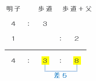 ※ お父さんは比の⑤、明子さんは比の④だけ歩いたら、2人の距離の差が20-17=3m縮まったので、比の⑤-④=①がその3mにあたる。