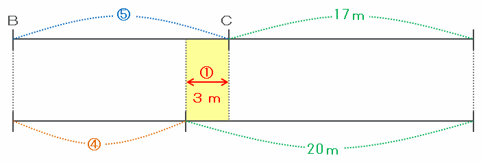 「⑤+17m」と「20m+④」を次の図のような2本の線分図に書きかえて並べてみると、比の⑤-④=①が20-17=3mにあたることが分かります。