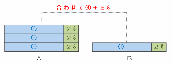 そのときの水そうAの水量は(①+2リットル)×3=③+6リットルなので、2つの容器の水量の合計は(①+2リットル)+(③+6リットル)=④+8リットルとなります(次の図参照)。