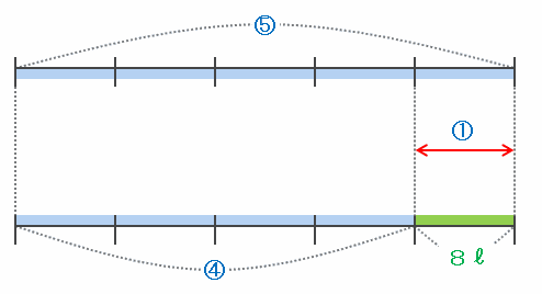 となり、しかもその水量の合計は等しいので、次のような長さの等しい線分図に表してみると、⑤-④=①が8リットルにあたることが分かります。