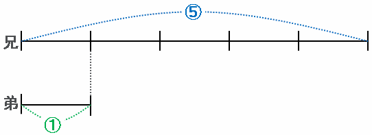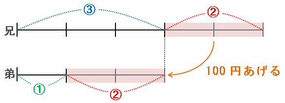 その2人の所持金をそろえるには、2人とも(5+1)÷2=3めもりにすればOKなので、次の図のように兄は弟へ5-3=2めもり分のお金を渡してあげます。