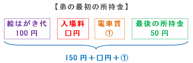帰宅するまでに弟が払ったお金は、絵はがき代の100円、美術館の入場料□円、そして電車賃の①なので、最初の所持金は50円+100円+□円+①=150円+□円+①と表せます。