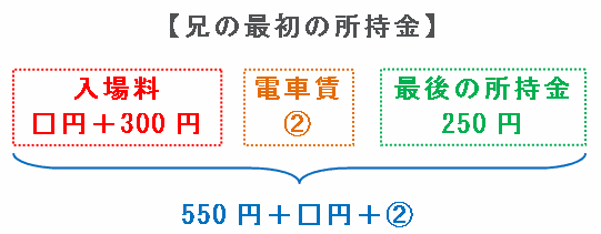 兄が帰宅するまでに払ったお金は、美術館の入場料□円+300円と電車賃の②なので、最初の所持金は250円+□円+300円+②=550円+□円+②となります。