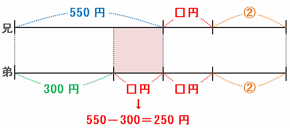 上の図のピンク色の部分が弟の電車賃にあたるので、答えは550-300=250円になります。