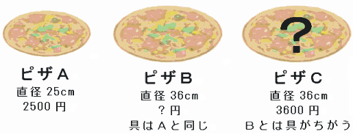 「直径25cmのピザ」をピザA、「直径25cmの2500円のピザと1㎠あたりの値段が同じになる直径36cmのピザ」をピザB、「直径が36cmで3600円のピザ」をピザCとします。