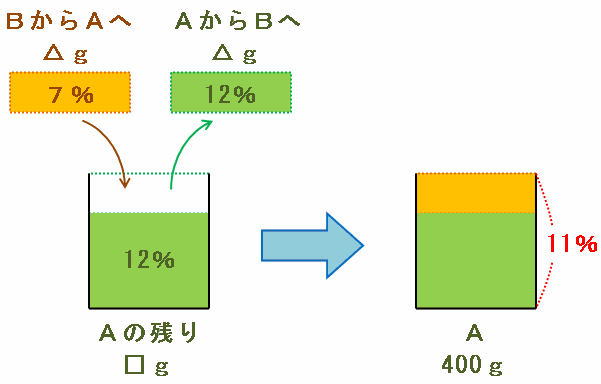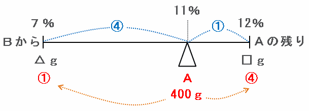 大まかに言うと、次の図のように「Aのビンに残っている濃度12%の食塩水□g」と「Bから取り出してAのビンに混ぜた濃度7%の食塩水△g」を混ぜたら、濃度11%の食塩水400gができました。