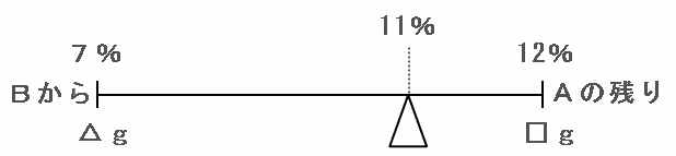 上の場面を天びん図に表すと、支点の左側にはBから来た濃度7%で重さ△gの食塩水、支点の右側にはAの残りである濃度12%で重さ□gの食塩水、そして支点の上には2つを混ぜた後の濃度である11%を次の図のように書き込みます。