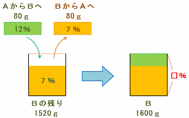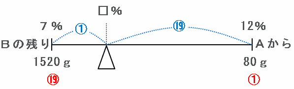 次の図のように、Bのビンには濃度7%の食塩水が1600-80=1520g残っていて、そこにAから濃度12%の食塩水が80gやってきます。