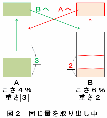 しかも、AとBからはどちらも同じ重さの食塩水を取り出して移し替えたので、図3の容器Aに入っている食塩水の重さの合計は3のままになっています。