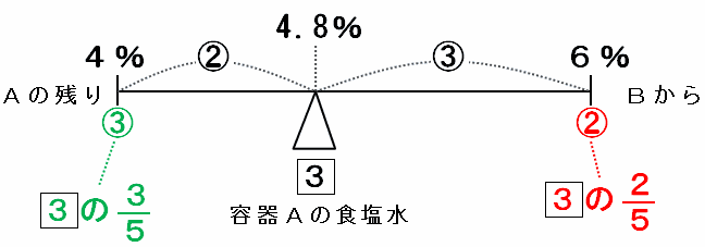また、AとBを混ぜてこさを4.8%にするためには、(1)と同じようにA:B=3:2の割合で混ぜればOKなので、たとえば容器Aの場合、Aの残り:Bから移した量=3:2になっているはずです。