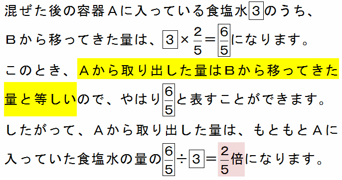 上の図のように、混ぜた後の容器Aに入っている食塩水の重さである3のうち、その5分の3はもともとAに入っていた量、そして5分の2はBから移ってきた量にあたります(比例配分)。