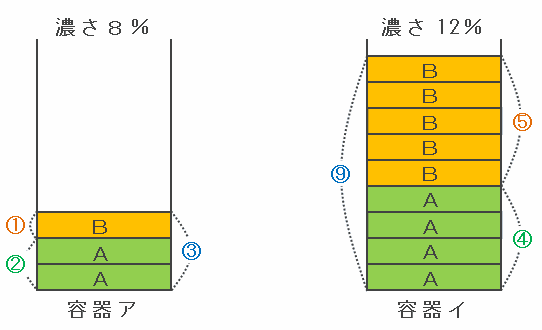 次の図のように、濃さ8%になった食塩水が入っている容器をア、濃さ12%になった食塩水が入っている容器をイとします。