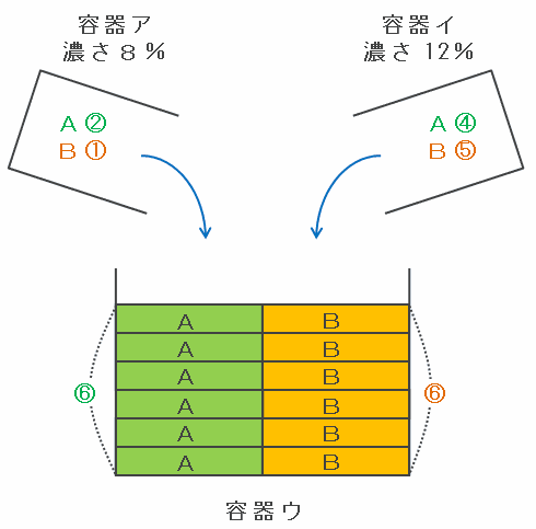 ・容器ア→食塩水Aが2、食塩水Bが1、食塩水の合計は2+1=3