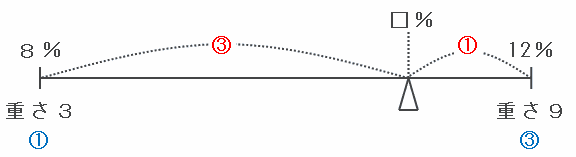そこで、その2つの食塩水を混ぜる様子を天びん図に表してみると次のようになります。