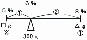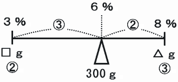 このとき、8%の食塩水の重さ(図の△g)は、300g×3分の1=100gになります。