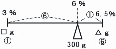 このとき、6.5%の食塩水の重さ(図の△g)は、300g×7分の6=7分の1800gになります。