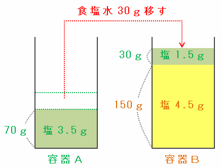 容器Aの食塩水30gの中には、食塩が30×0.05=1.5g含まれているので、次の図のように容器AからBへ食塩水を30g移すと、