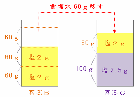 また、このやり取りを終えた後、容器Cには食塩水が100+60=160g、そして食塩が2.5+2=4.5g含まれています。