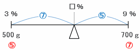 したがって、「濃さ3%の食塩水500g」と「濃さ9%の食塩水700g」を混ぜてできる食塩水の濃度を、次のような天びん図を使って求めてみます。