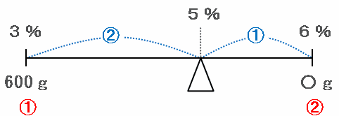 このとき、上の図2では「濃さ6%の食塩水○g」と「濃さ3%の食塩水600g」を混ぜたら「濃さ5%の食塩水」ができたので、その様子を天びん図に表すと次のようになります。
