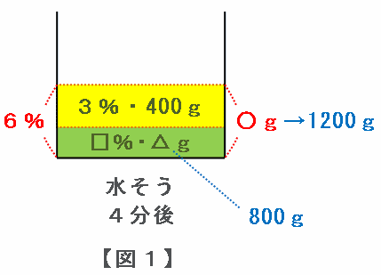 つまり、図1の水そうに最初から入っていた食塩水の量は、次の図のように1200-400=800gになります。