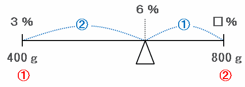 求める濃度(図の□%)は左はしの3%から0.5×⑦=3.5%進んだ地点にあるので、答えは3+3.5=6.5%になります。