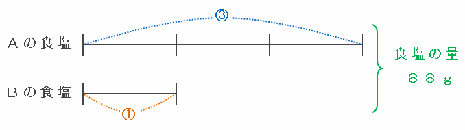 2つの容器に含まれる食塩の量の合計は48+40=88gなので、Aに含まれている食塩の量がBに含まれている食塩の量の3倍になったときの関係を線分図に表すと次のようになります。