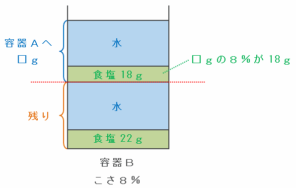 上の図のように、容器Aへ移ったこさ8%の食塩水□gのうち、食塩の量は18gなので、Aへ移った食塩水の量は18÷0.08=225gになります。