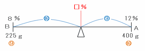次のように、「Bから移ったこさ8%の食塩水225g」と「Aに入っていたこさ12%の食塩水400g」を混ぜる天びん図を利用して答えを求めます。